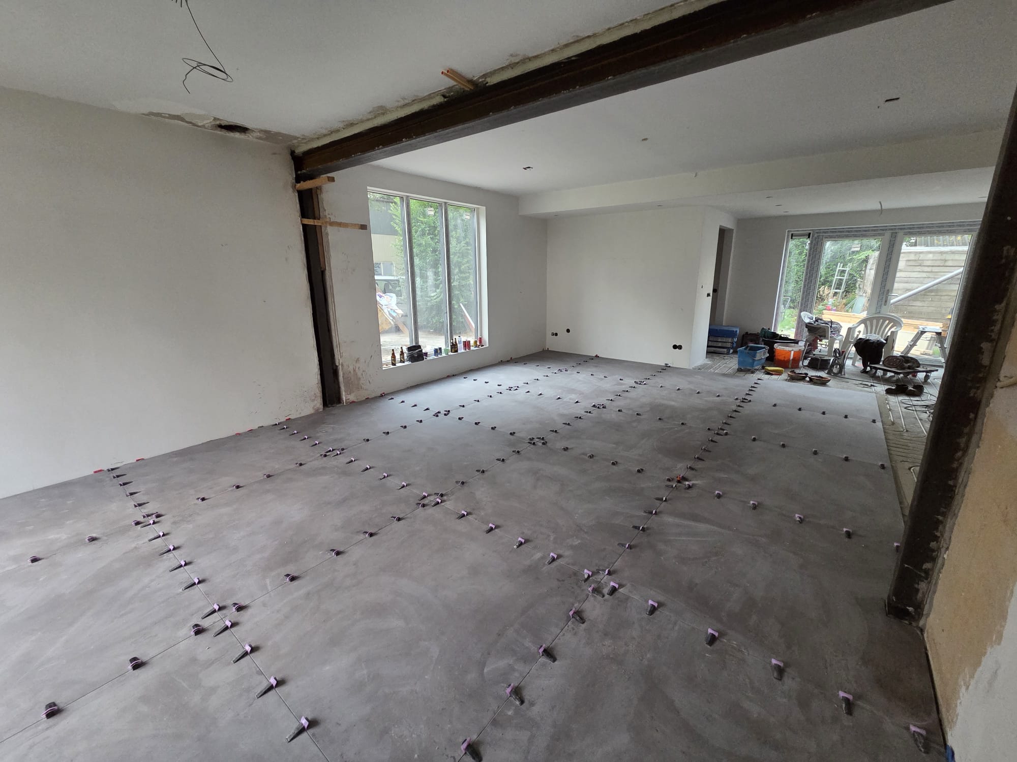 Tijdens de ruwbouwfase hebben we nieuwe elektra en loze leidingen aangebracht. In dit project werd gekozen voor tegelwerk op de vloer. De foto’s laten zien hoe de egalisatielaag en tegels strak zijn aangebracht met behulp van clipsystemen voor perfect vlak resultaat, een techniek die we vaker toepassen bij projecten waar een strakke afwerking centraal staat.
