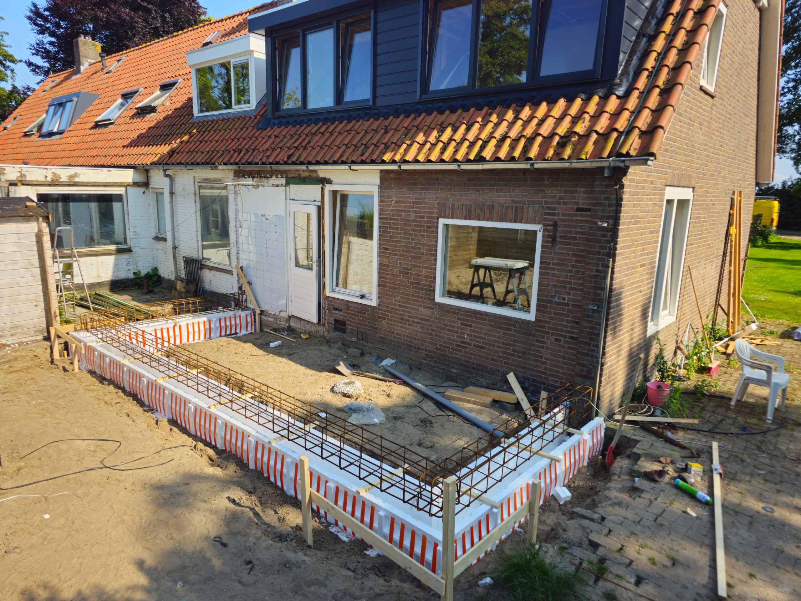 Het project begon met het verwijderen van de oude aanbouwdelen en het uitzetten van nieuwe funderingsstroken. Op de foto’s is duidelijk te zien dat we gekozen hebben voor een zwaar gewapende fundering, inclusief breedplaatwapening, koppelstaven en een strakke bekisting. Dit is essentieel voor aanbouwen waarin een grote doorbraak wordt gemaakt in de bestaande gevel, en dat vereist altijd een constructieberekening voor een aanbouw.