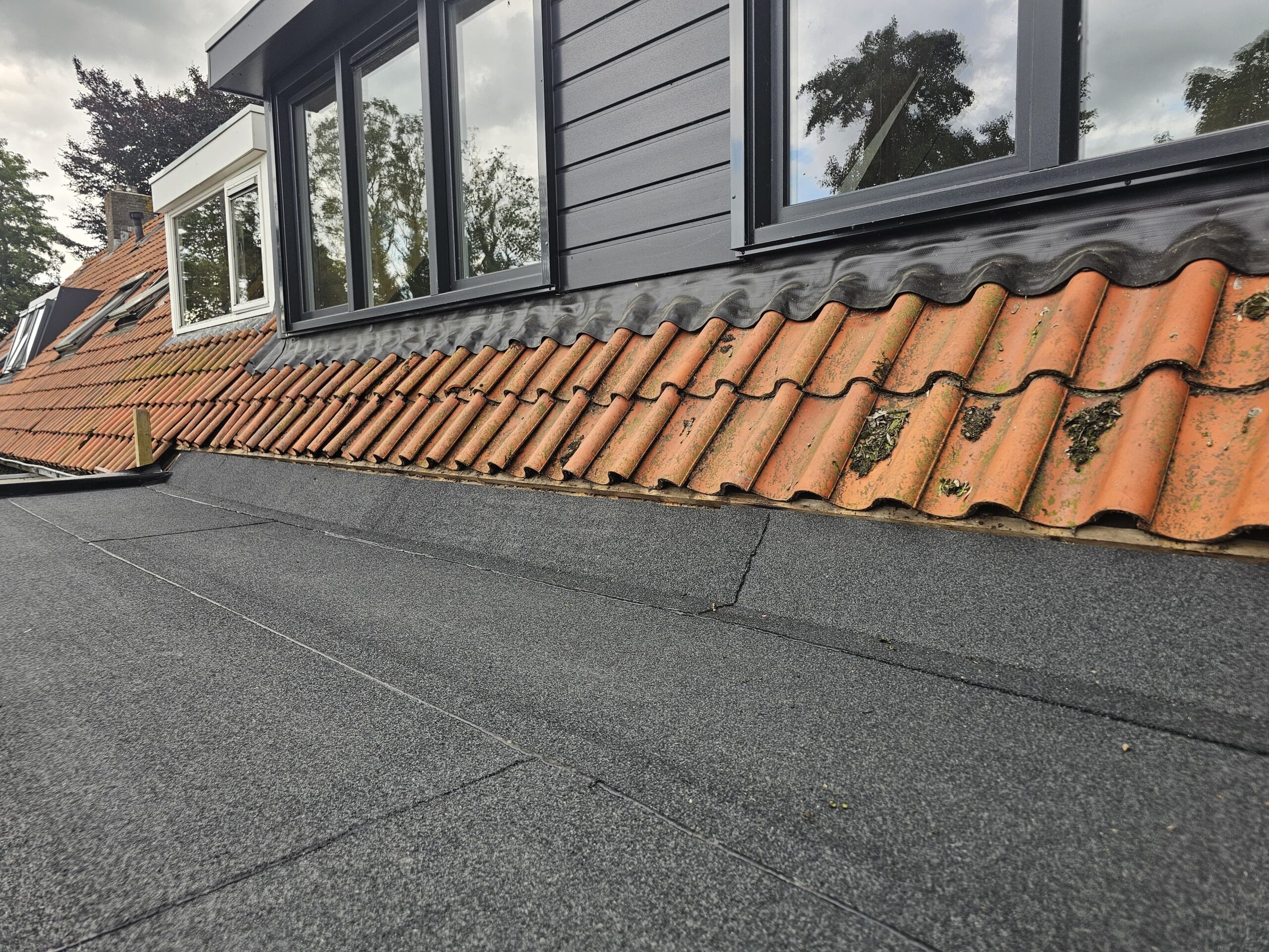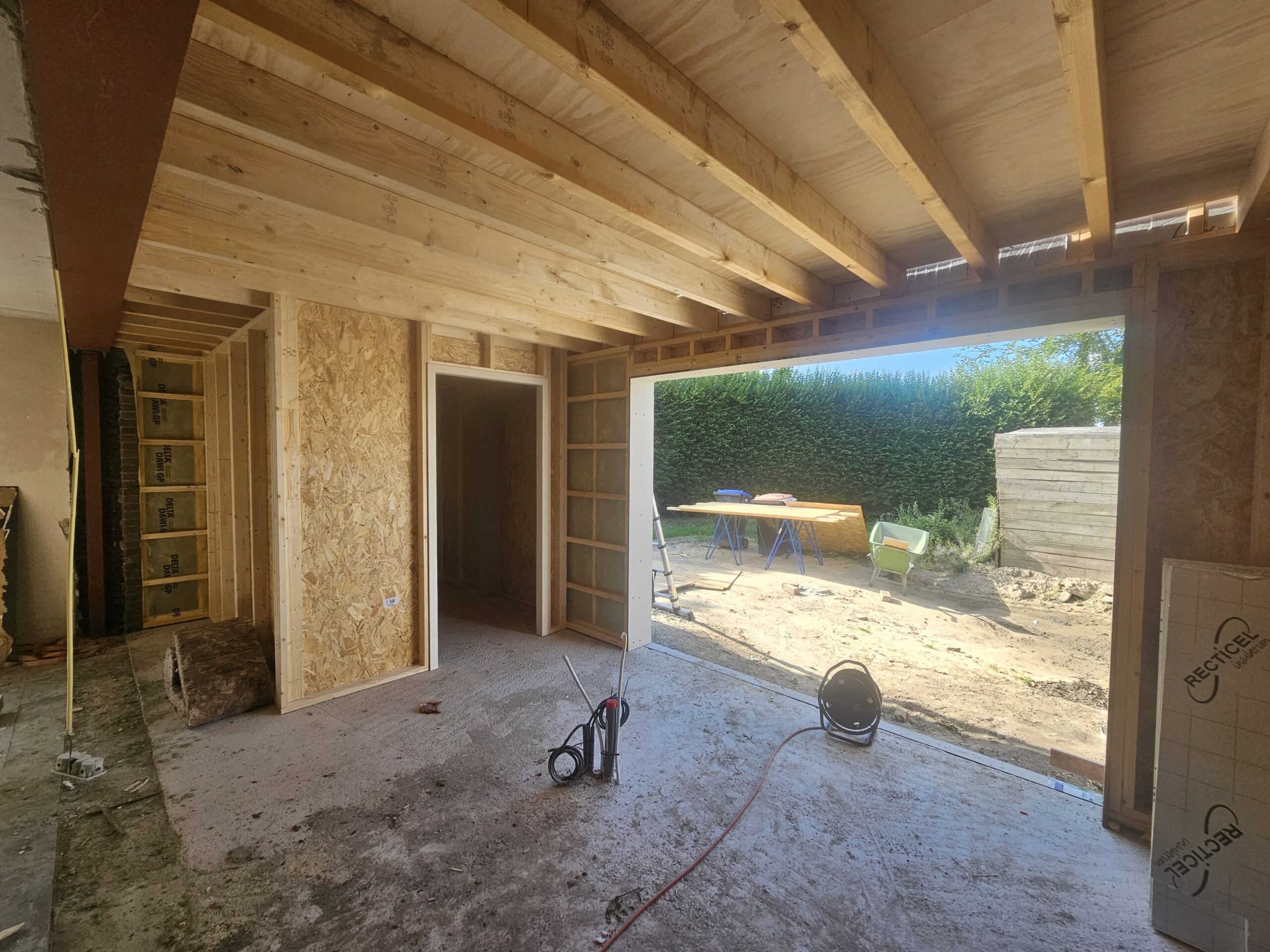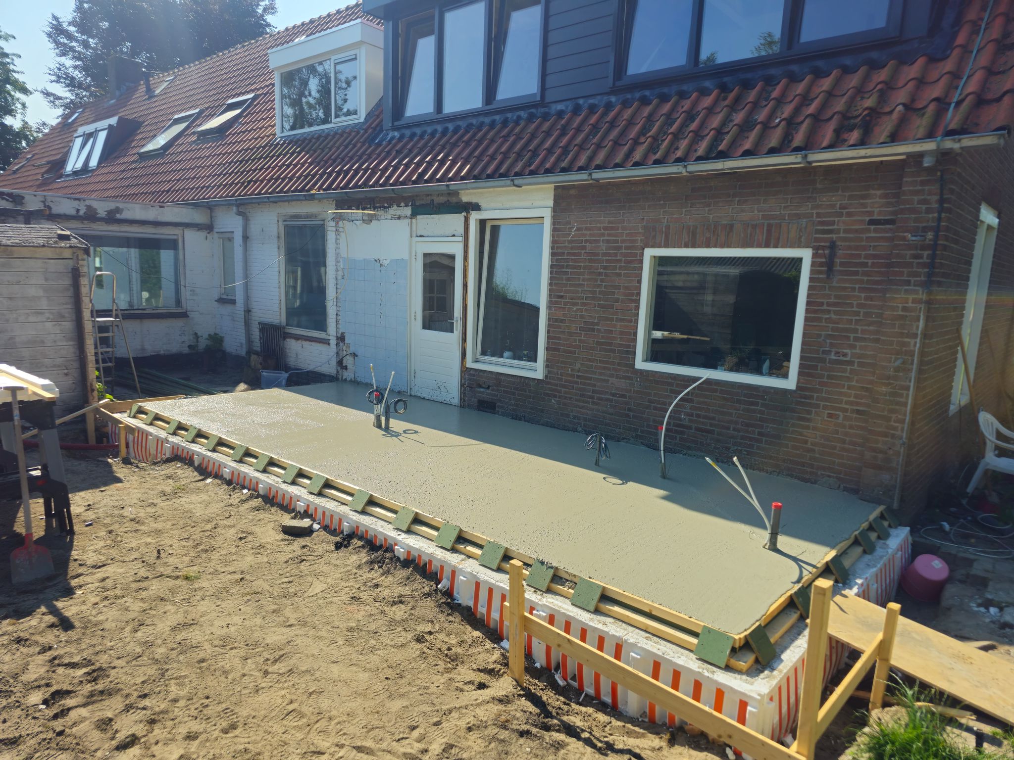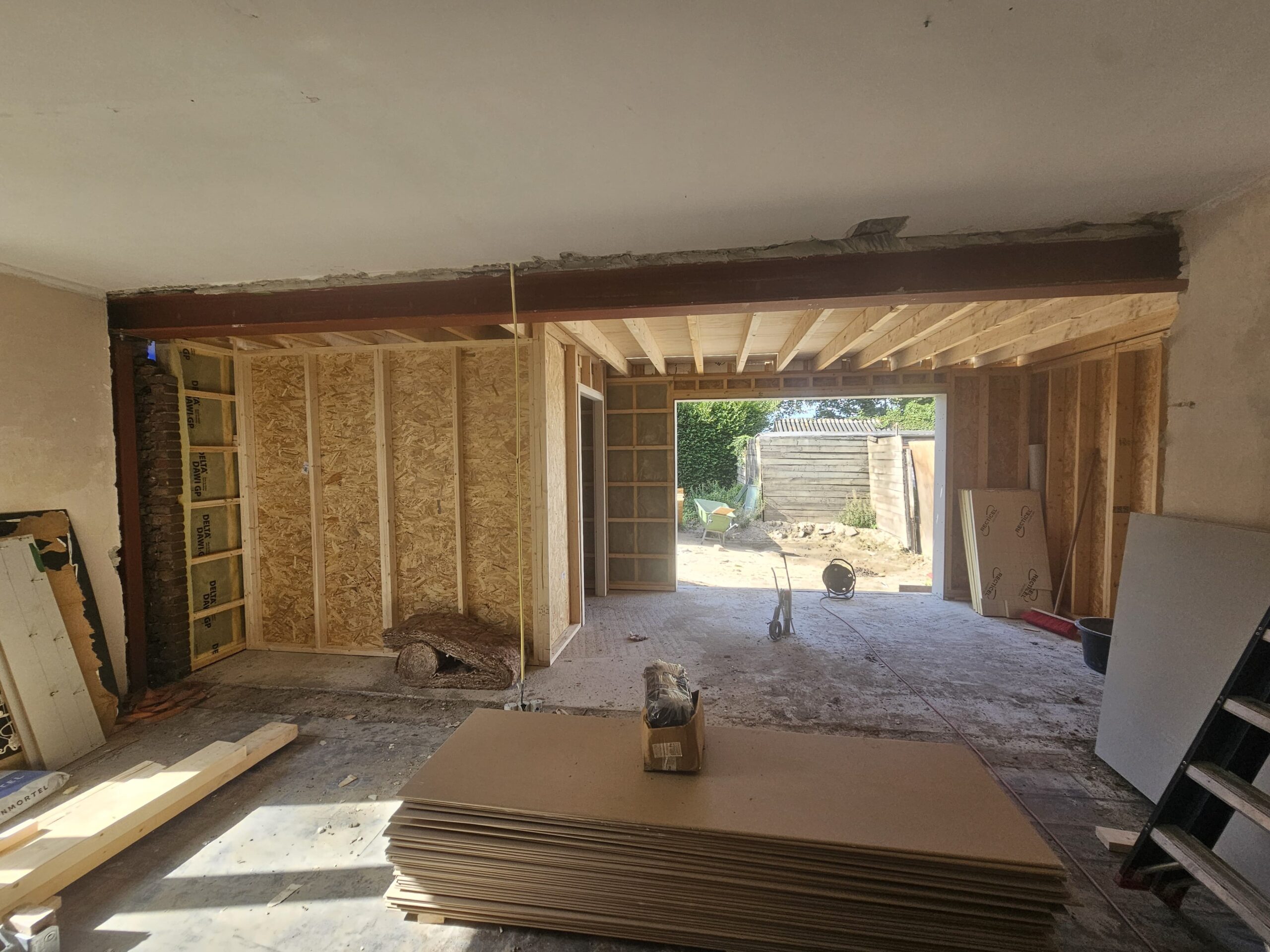 Nadat de betonvloer was gestort en uitgehard, is de HSB-constructie geplaatst: OSB binnenbeplating, dampremmende folie en een goed geïsoleerde wandopbouw. Vervolgens hebben we het platte dak opgebouwd, aangesloten op het bestaande dakvlak en voorzien van een hoge isolatiewaarde (Rc > 6,0). Dit maakt de aanbouw energiezuinig en geschikt voor lage temperatuur verwarming.