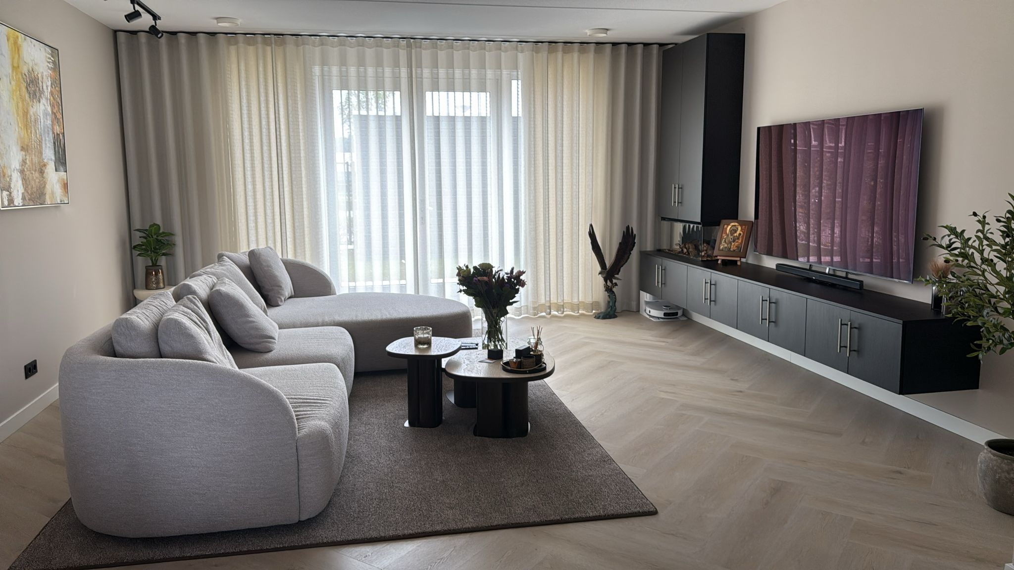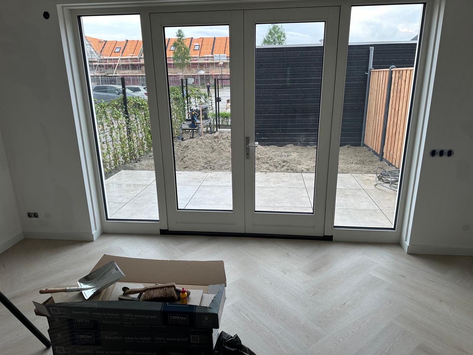 De brede kunststof schuifpui zorgt voor veel licht en een directe verbinding met de tuin. Schuifdeuren plaatsen in een aanbouw zoals deze is een van de meest gekozen oplossingen in Werkendam, omdat het zowel ruimtebesparend als stijlvol is. De afwerking binnen bestaat uit glad stucwerk, nieuwe elektra en een vloer die doorloopt vanuit de bestaande woonkamer, waardoor de woning één geheel vormt.