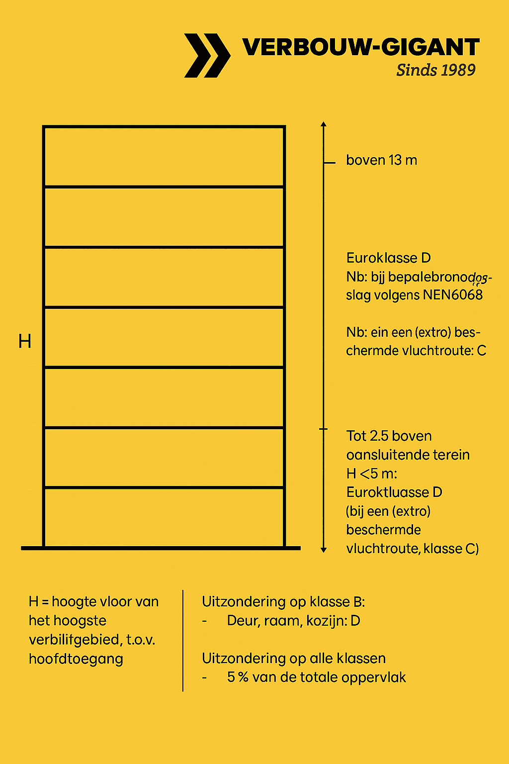 Voor nieuwbouw waarbij de voor personen bestemde vloer hoger ligt dan 5 meter boven meetniveau, moet de onderste 2,5 meter van de gevel voldoen aan brandklasse B. Dat is zwaarder dan de gebruikelijke basiseis van klasse D. Daarnaast moeten geveldelen boven 13 meter eveneens aan brandklasse B voldoen.