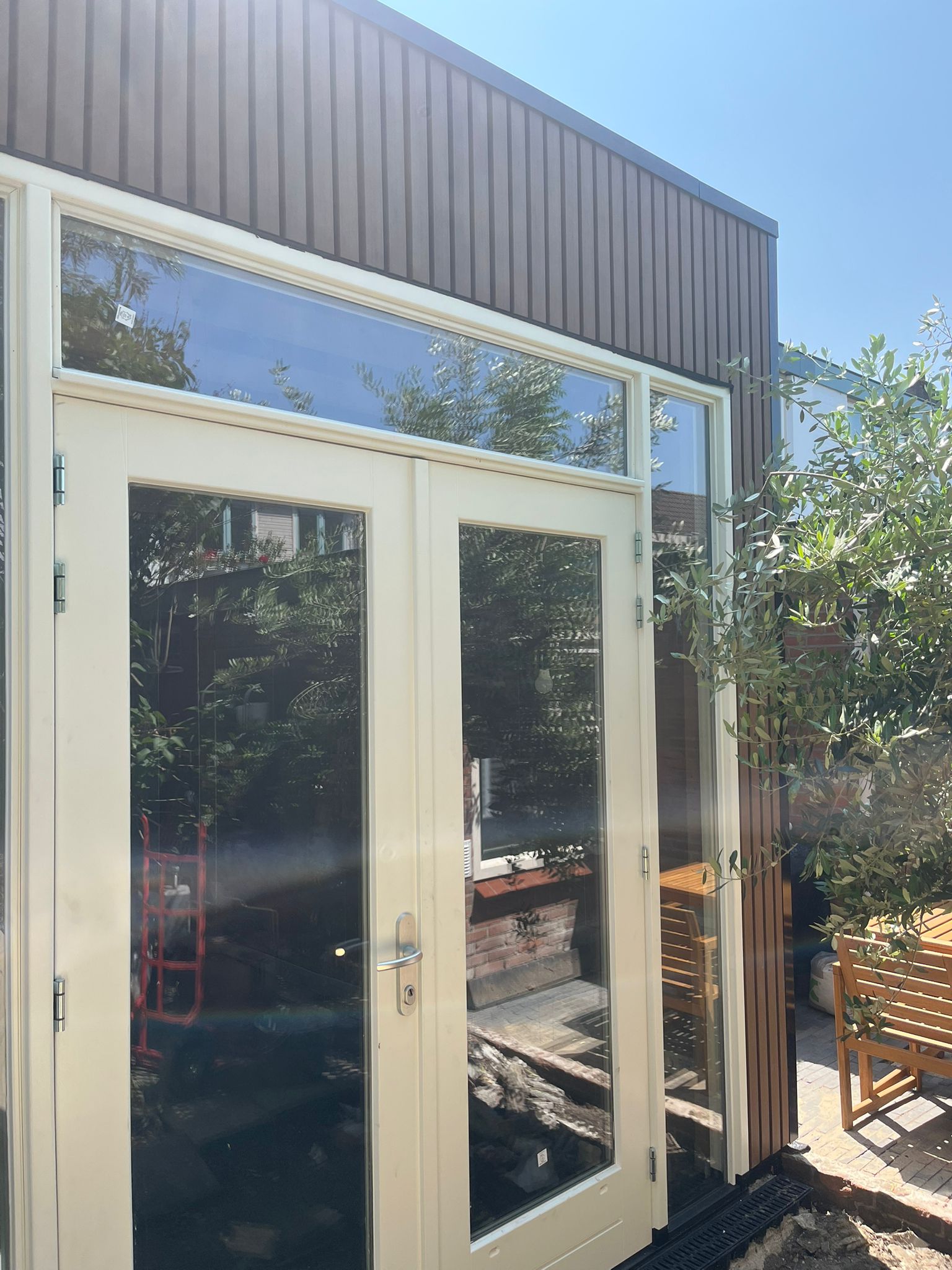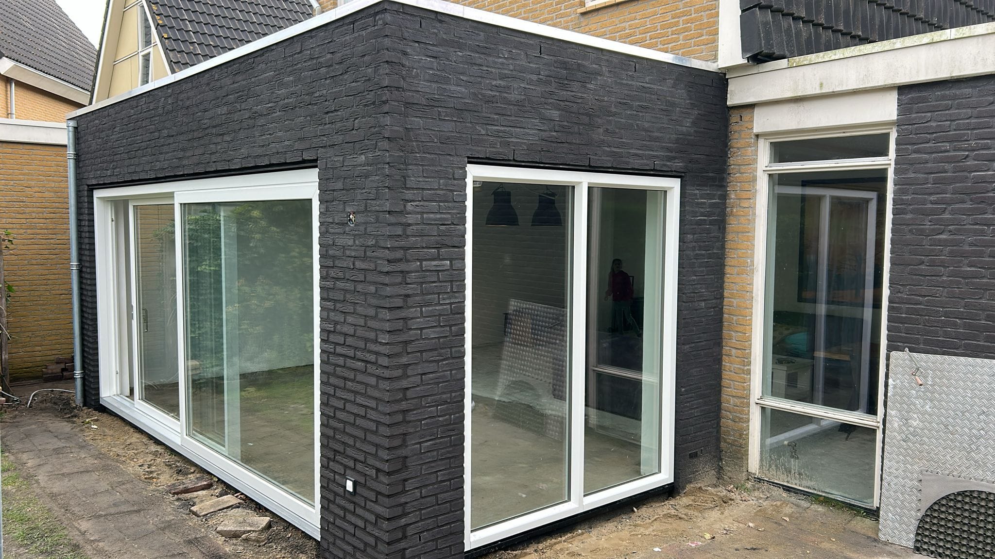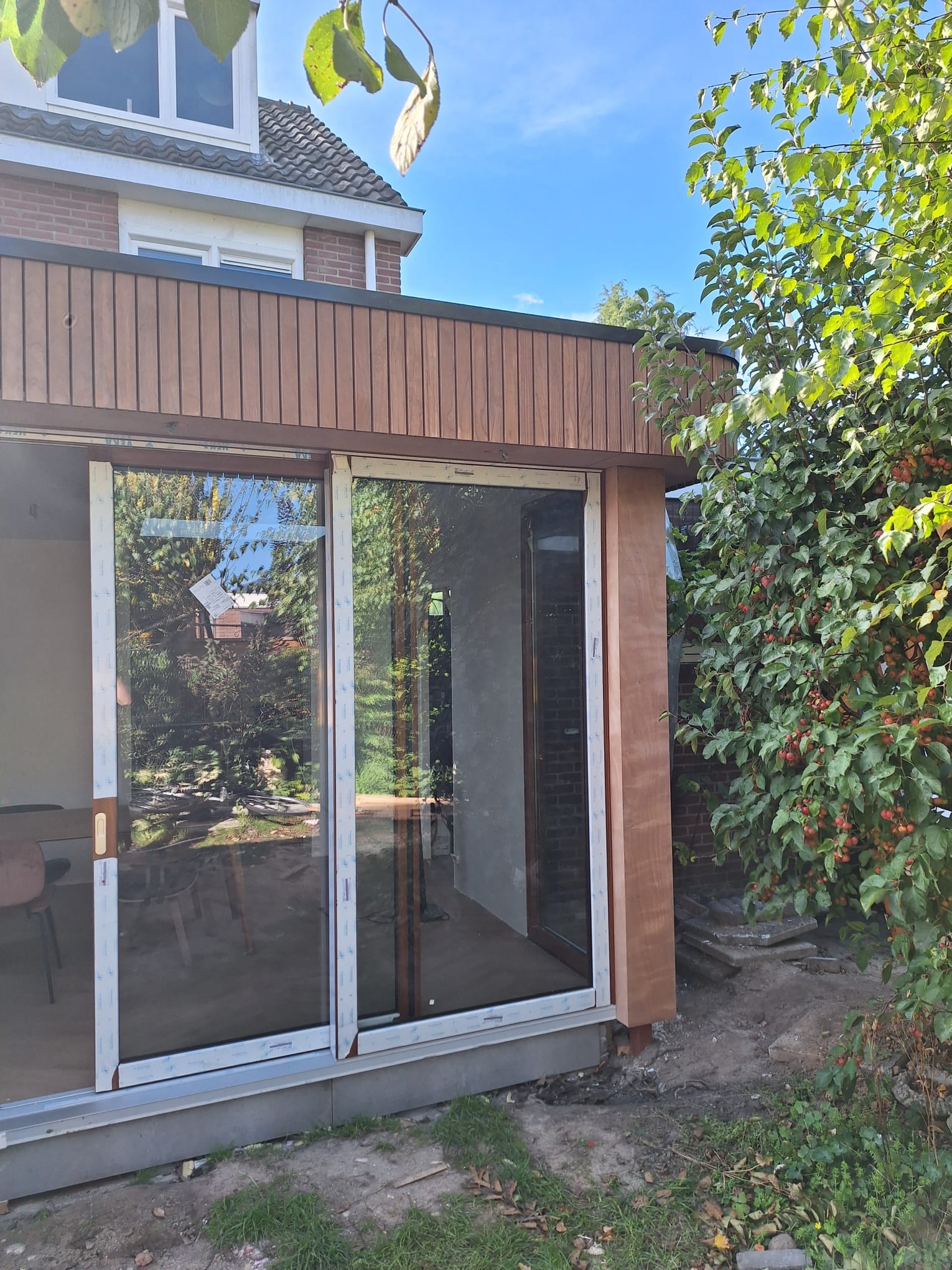 Gouda: uitbouw 5 meter, hoekwoning met zijlicht. Schroefpalen, zonwerend glas, akoestische wand. Bouw 5 weken.