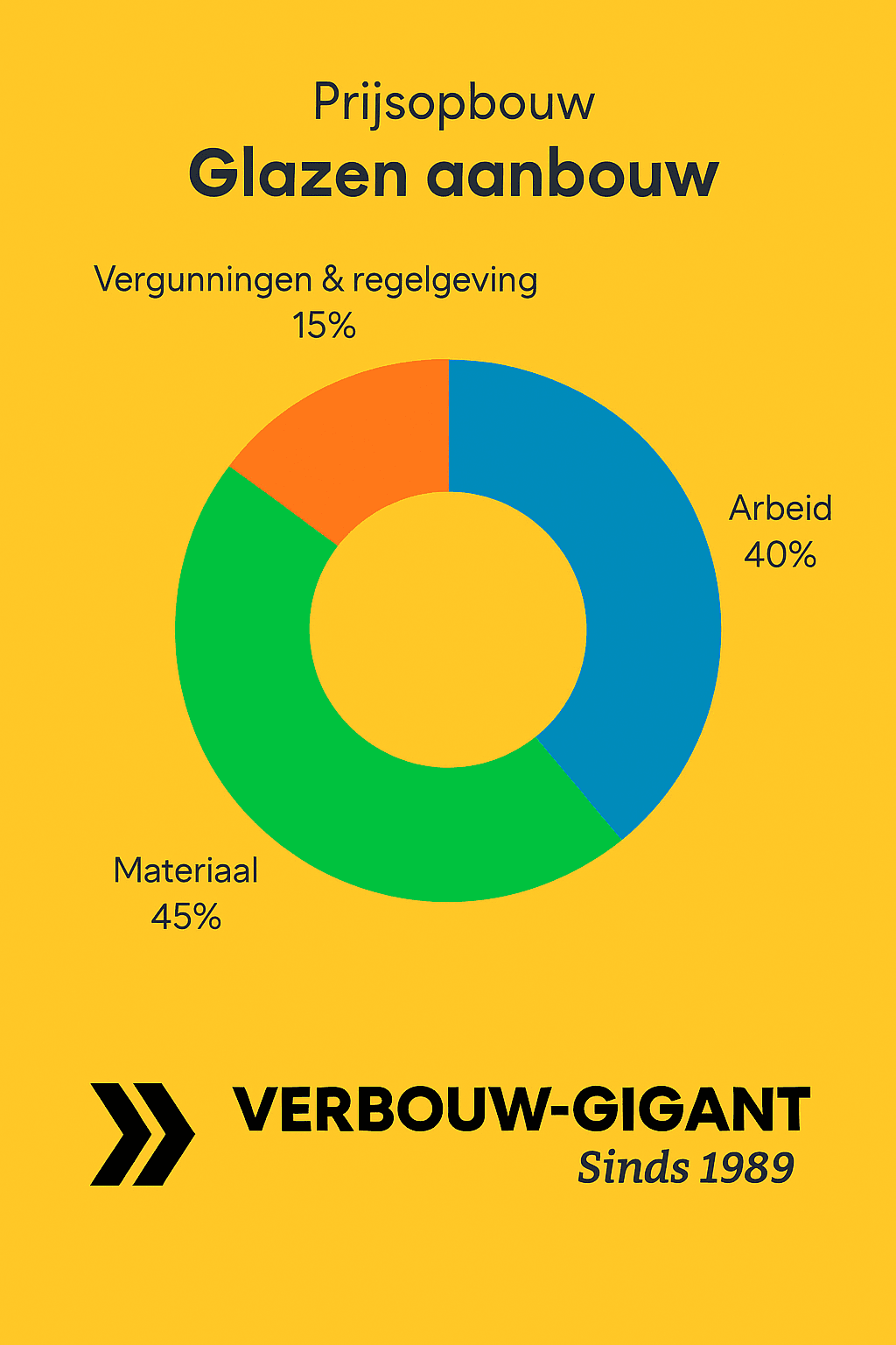 Voor een complete glazen aanbouw met fundering, geveldoorbraak en nette afwerking ligt een realistische bandbreedte rond € 3.300 tot € 4.600 per m², afhankelijk van glaskeuze, constructie en afwerking.