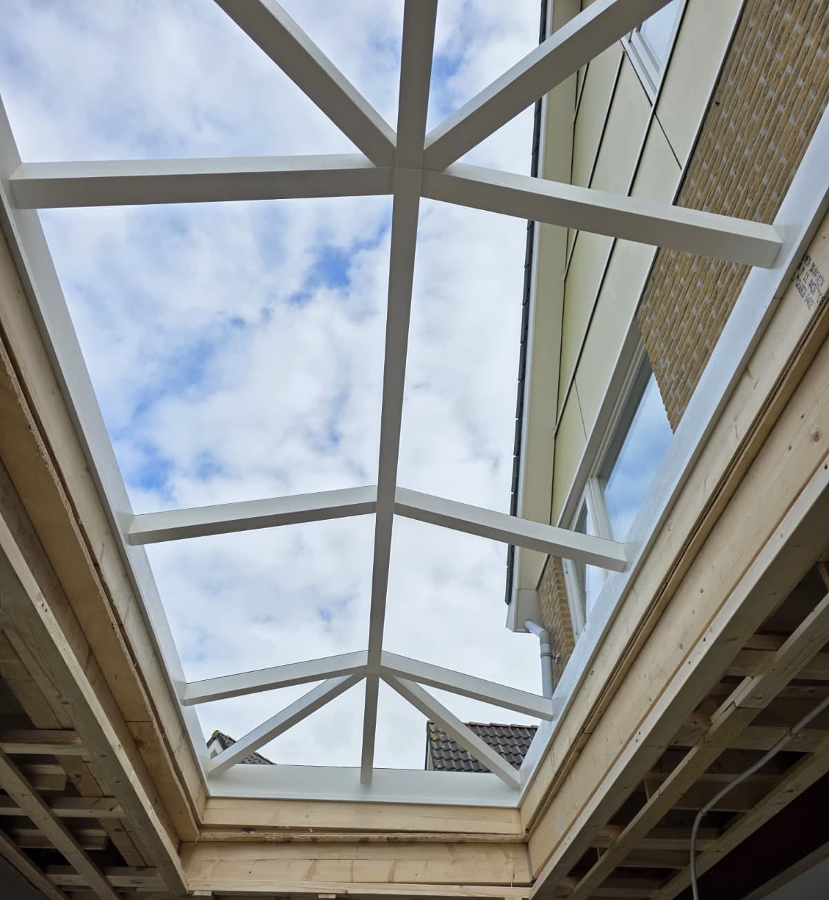 Bij een nieuwe aanbouw loont het om openingen vooraf te ontwerpen: denk aan draagkaders, afschot en afwatering. In onze werkplaats bereiden we uitsparingen en kaders voor. De plaatsing prefab dak zorgt dat de sparing exact klopt, de folies doorlopen en het water netjes weg kan. Zo ligt de lichtstraat of het dakraam in één strakke handeling in het dak en voorkomt u improviseren op de steiger.