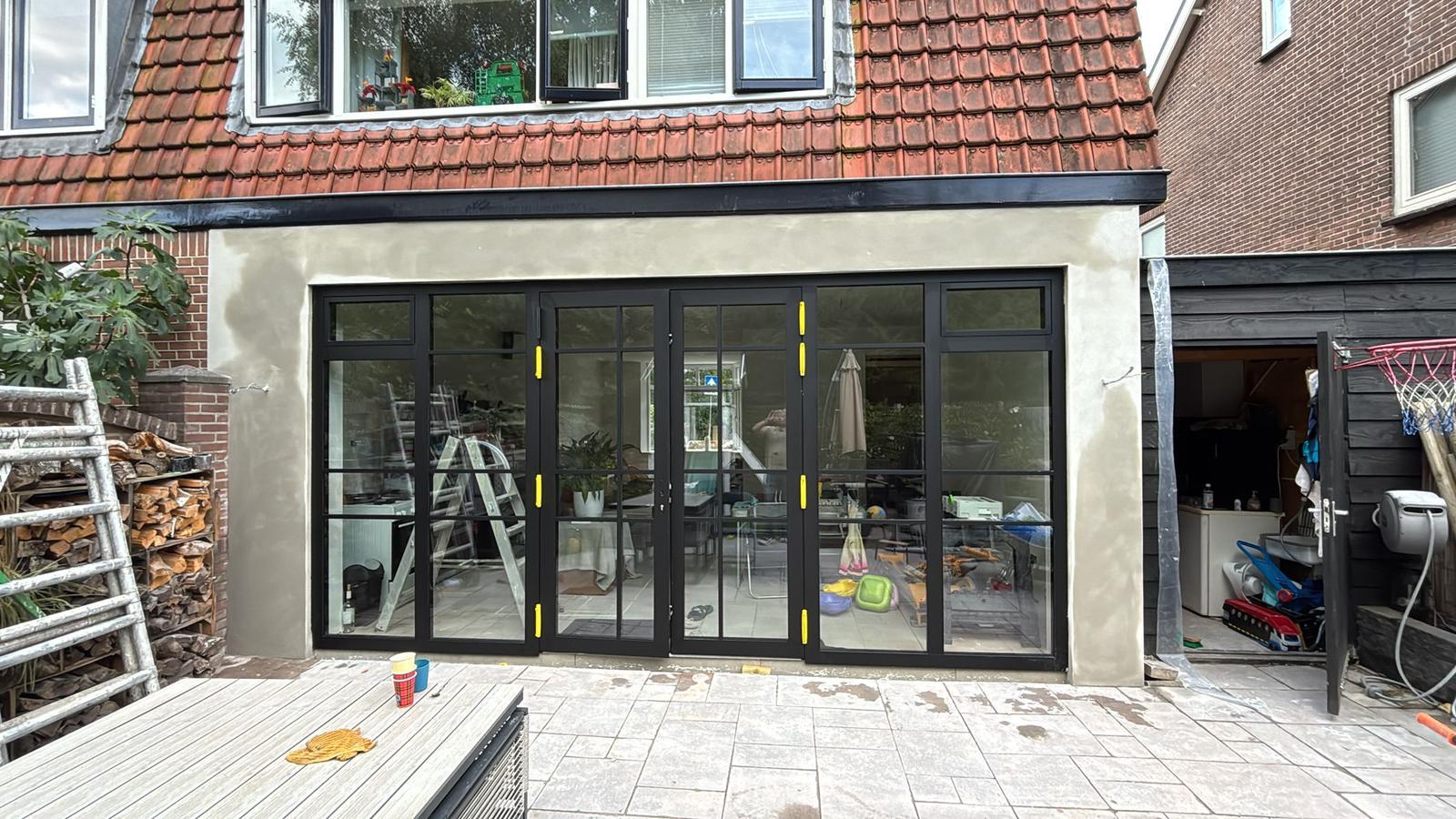 Amersfoort: uitbouw met lichtstraat, houten plafond en zwarte aluminium schuifpui. RC 5,0, volledig vergunningsvrij gebouwd.